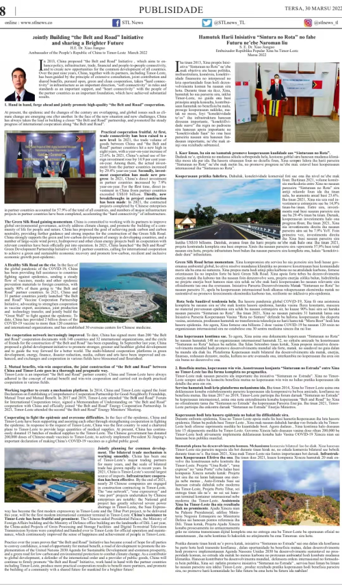 2022年3月30日,驻东帝汶大使肖建国在东主流报纸《东帝汶之声》发表题为《携手共建“一带一路” 共同谱写美好未来》的署名文章,全文如下: