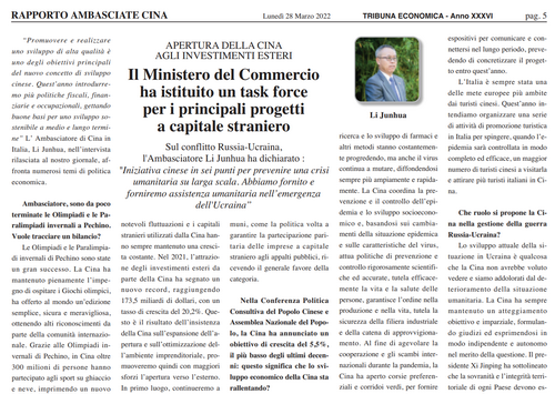 2022年3月28日,驻意大利大使李军华就北京冬奥会、2022年全国两会、中意关系和乌克兰局势等议题接受意《经济讲坛报》专访,全文如下: