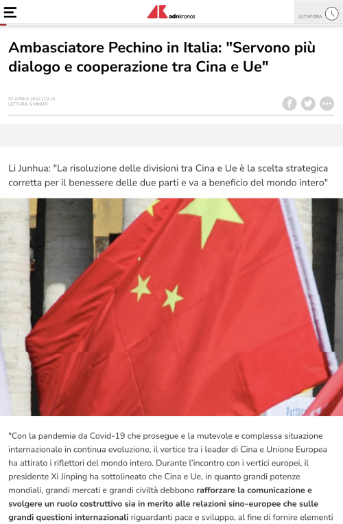 2022年4月7日,驻意大利大使李军华在意阿德恩克罗诺斯通讯社发表署名文章《越是困难时刻中欧越需对话合作》,全文如下: