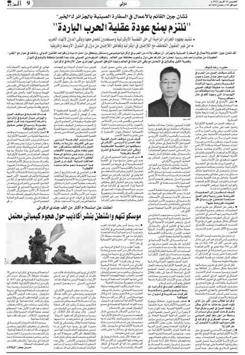 2022年4月14日,驻阿尔及利亚使馆临时代办钱进接受阿发行量最大的纸媒《消息报》专访,就中国在乌克兰问题上立场等问题回答了记者提问。专访全文如下: