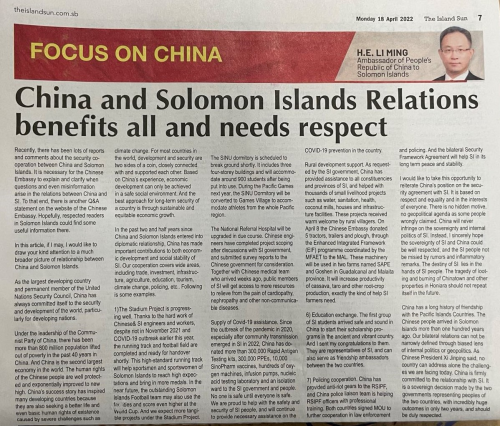 2022年4月18日、20日,所罗门群岛主流报纸《岛屿太阳报》《所罗门星报》刊登驻所罗门群岛大使李明文章,介绍中所关系和两国安全合作,强调互利共赢本质。主要内容如下: