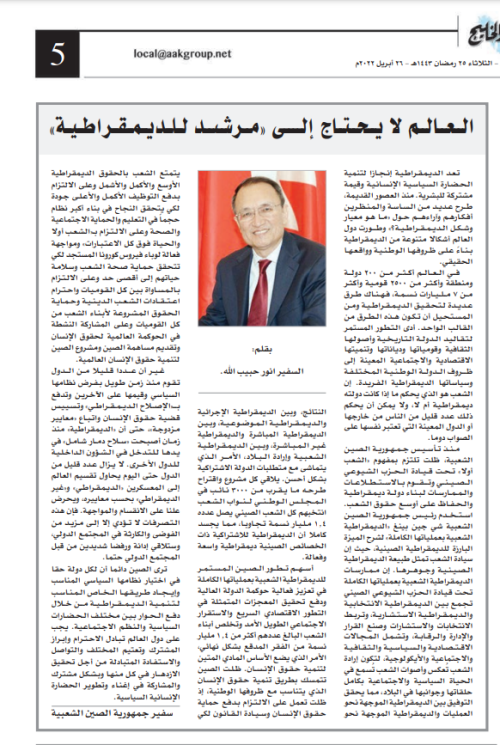 2022年4月26日,驻巴林大使安瓦尔在巴林主流媒体《海湾消息报》发表署名文章《世界不需要民主“教师爷”》,介绍习近平主席提出的全过程人民民主重要理念。文章全文如下: