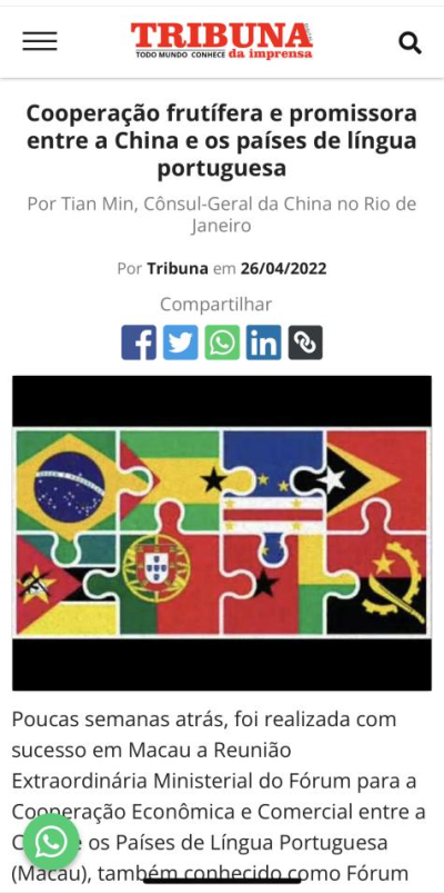 2022年4月26日,驻里约热内卢总领事田敏在《商业观察报》、《媒体论坛报》等巴西主流媒体发表题为《中国与葡语国家合作成果丰硕、前景可期》的署名文章。全文如下: