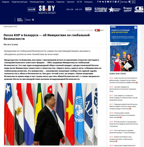 2022年5月12日,驻白俄罗斯大使谢小用在《今日白俄罗斯报》发表署名文章宣介全球安全倡议。文章全文如下: