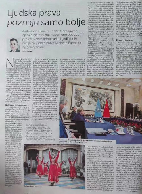 2022年6月12日,就联合国人权高专巴切莱特访华,驻波黑大使季平在波黑波族主流媒体《解放报》发表题为《人权保障没有最好,只有更好》的署名文章,介绍巴切莱特高专访华有关情况以及中国在人权保障方面的举措和成就,指出美西方国家炒作的涉疆问题不是人权问题,而是涉及维护中国国家主权、安全和领土完整的核心问题,强调中国将继续坚定不移走符合自身国情的人权发展道路,积极开展国际人权交流合作,深入参与全球人权治理,共同促进全球人权事业健康发展,推动构建人类命运共同体。全文如下: