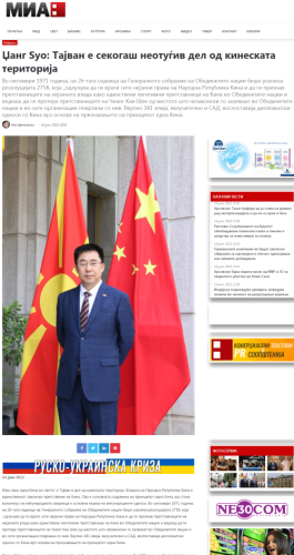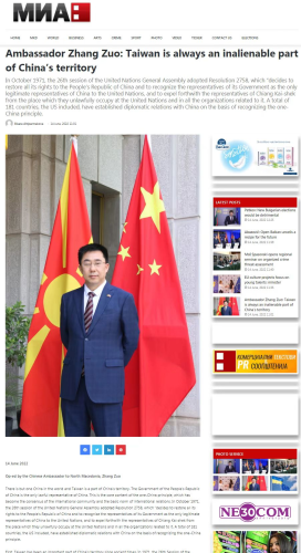 2022年6月14日,驻北马其顿大使张佐在北马国家通讯社网站以马其顿文和英文发表署名文章《台湾从来都是中国领土不可分割的一部分》,北马多家媒体予以转载。全文如下:
