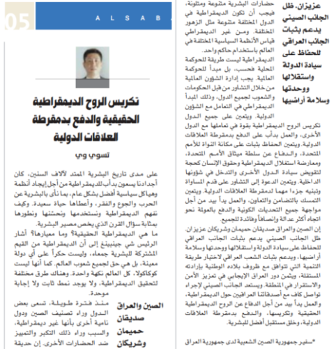 2022年6月13日,驻伊拉克大使崔巍在伊最大官方报纸《晨报》发表署名文章《弘扬真正民主精神,推进国际关系民主化》,全文如下: