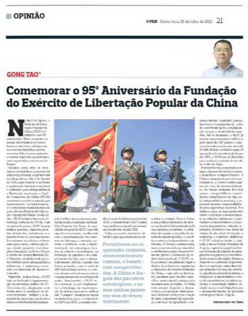 2022年7月29日,驻安哥拉大使龚韬在安《国家报》发表署名文章《庆祝中国人民解放军成立95周年》,全文如下: