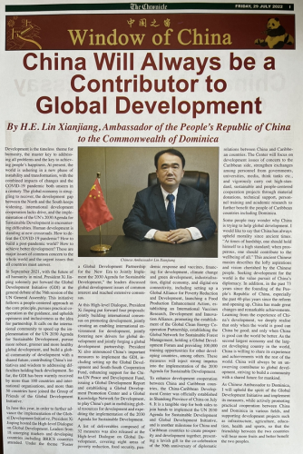 2022年7月29日,驻多米尼克大使林先江在多主流媒体《纪事报》发表署名文章《中国始终不渝做全球发展的贡献者》,宣介习近平主席提出的全球发展倡议。全文如下: