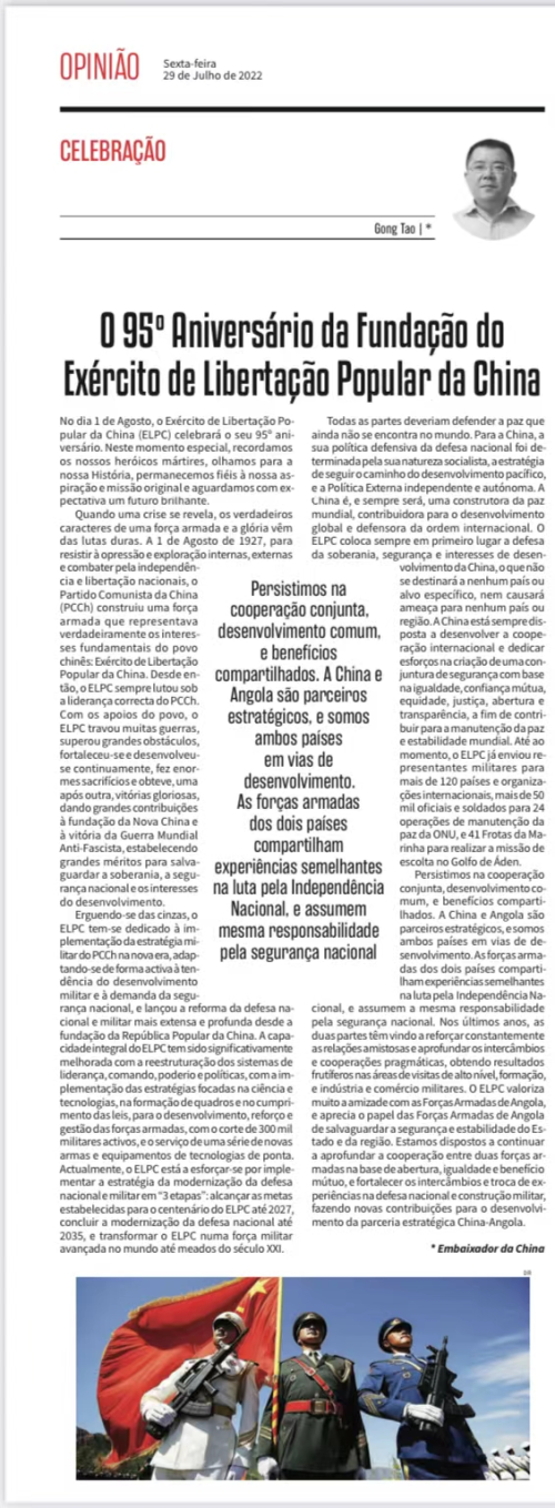 2022年8月1日,驻安哥拉大使龚韬在安《安哥拉日报》发表署名文章《中国隆重纪念解放军建军节》。表示今年8月1日,中国人民解放军喜迎95岁华诞,值此特殊时刻,我们缅怀英雄先烈,回顾过往历程,坚定初心使命,展望美好未来。