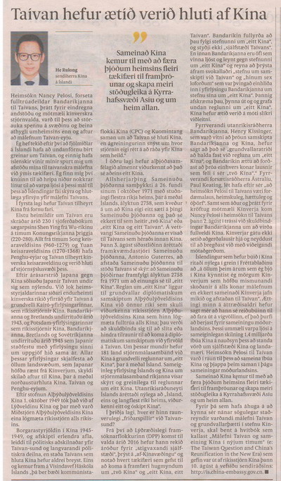 2022年8月31日,驻冰岛大使何儒龙在冰岛主流媒体《消息报》上发表题为《台湾一直是中国的一部分》的署名文章。全文如下: