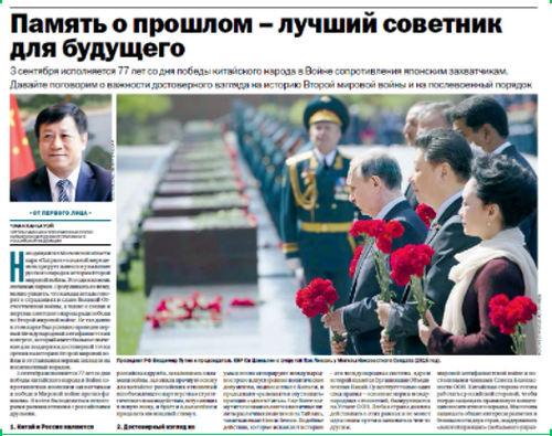 在中国人民抗日战争暨世界反法西斯战争胜利纪念日前夕,驻俄罗斯大使张汉晖于2022年9月2日在俄罗斯《劳动报》发表署名文章《前事不忘,后事之师——维护正确二战历史观,捍卫正确战后秩序观》。全文如下: