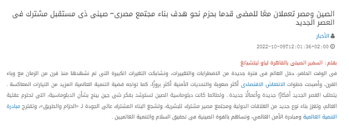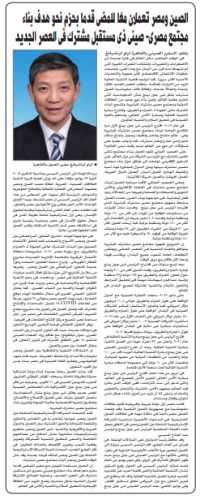 当前,中国全面建设社会主义现代化国家的新征程已经开启,中国共产党第二十次全国代表大会将于10月16日召开。在习近平新时代中国特色社会主义思想特别是习近平外交思想指引下,中国将坚定不移深化改革开放,实现经济高质量发展,推动构建人类命运共同体。中埃全面战略伙伴关系已成为中国同阿拉伯、非洲、发展中国家团结合作、互利共赢的典范。中埃两国在捍卫自身利益、追求共同发展、增进人民福祉、促进世界公平正义的事业中,理念相通,战略契合。新形势下,中埃全面战略伙伴关系发展面临新机遇,中埃构建命运共同体正当其时。中国愿同埃及一道携手努力,坚定朝着新时代构建中埃命运共同体的目标迈进,共同维护发展中国家共同利益,为实现世界和平、发展与安全注入更多正能量。