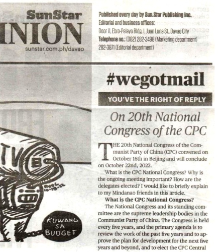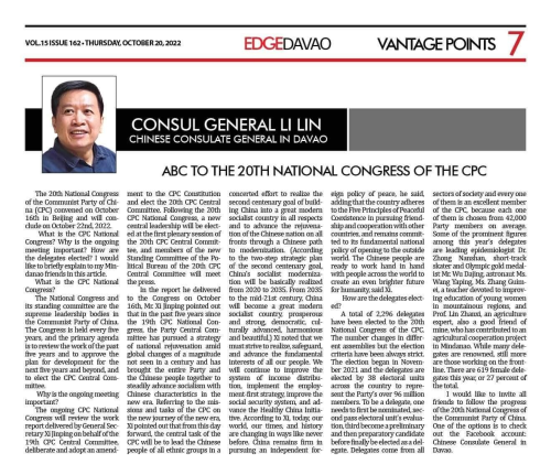 2022年10月20日,驻达沃总领事黎林在《达沃优势报》和《达沃太阳星报》发表署名文章《中国共产党二十大简介》,以浅显语言向菲律宾棉兰老岛民众宣介党的二十大。