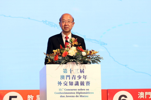 非常高兴再次出席澳门青少年外交知识竞赛总决赛。首先,我谨代表外交部驻澳公署,向一直以来关心和支持澳门青少年外交知识竞赛的澳门中联办、驻澳部队,向特区政府社会文化司、教育及青年发展局、澳门基金会、澳门中华教育会、澳门天主教学校联会、澳门公职教育协会,向各位评委、媒体界的朋友,以及所有积极参赛的34所中学的校长、老师、同学们表示衷心感谢,对进入今天总决赛的8所中学的校长、老师和同学们致以热烈祝贺!
