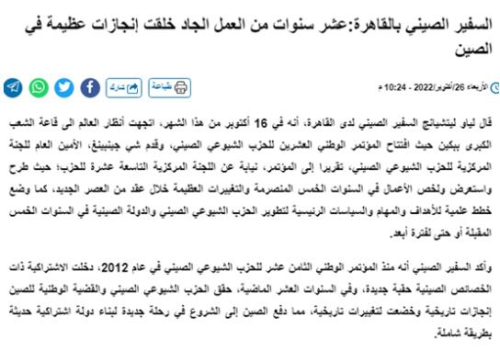 2022年10月26日,驻埃及大使廖力强在埃媒体《国家回声网》发表题为《十年砥砺奋进创造中国新时代伟大成就》的署名文章,积极宣介中国共产党第二十次全国代表大会。文章主要内容如下: