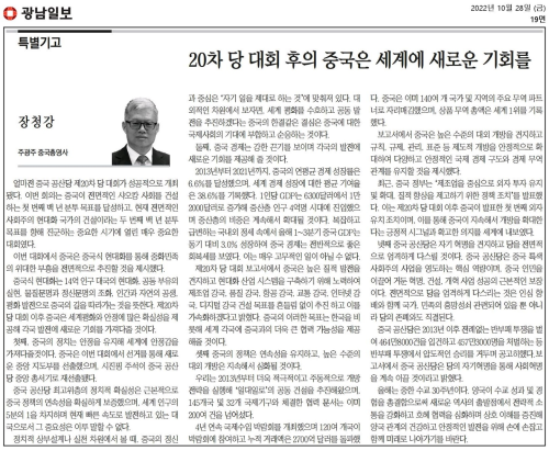 2022年10月28日,驻光州总领事张承刚在韩国《光南日报》发表署名文章《二十大后的中国将为世界带来新机遇》,介绍中国共产党第二十次全国代表大会召开情况及重要意义,强调二十大后的中国将为世界和平与稳定提供更多确定性,为各国发展带来新机遇。全文如下: