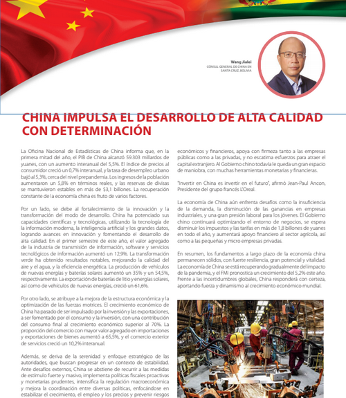 2023年8月4日,驻圣克鲁斯总领事王家雷在玻利维亚《对外贸易》杂志发表题为《中国稳步推进高质量发展》的署名文章,介绍当前中国经济形势。文章全文如下: