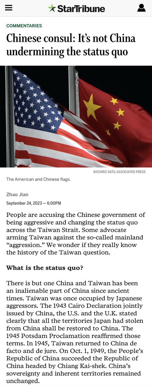 2023年9月25日,驻芝加哥总领事赵建在美中西部地区英文媒体《论坛星报》评论版发表署名文章,介绍台湾问题历史经纬,向美国读者详细讲述什么是台海的真正现状,揭露到底是谁在企图改变现状,强调指出,要维护台海现状、维护台海和平稳定,就必须不折不扣坚持一个中国原则,坚决反对“台独”。文章全文(中译文)如下: