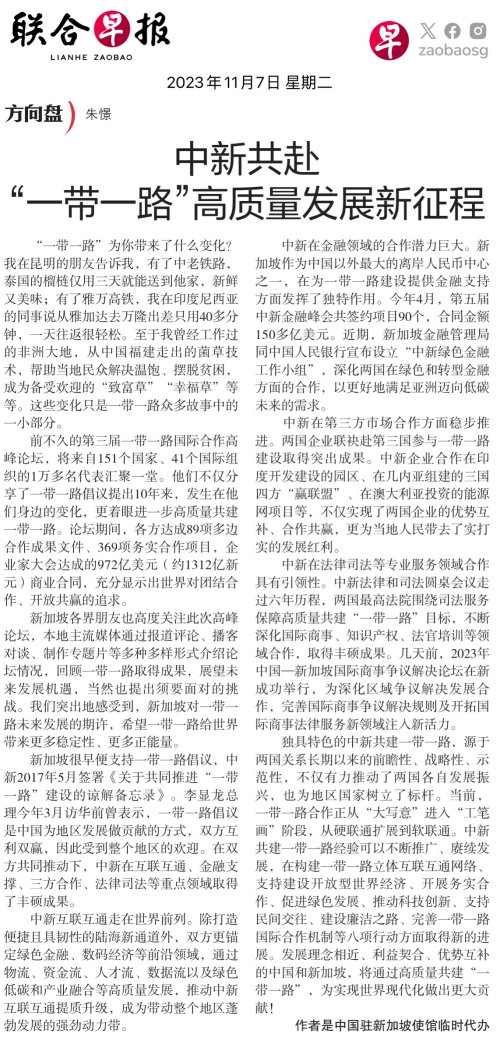 2023年11月7日,驻新加坡使馆临时代办朱憬在《联合早报》发表题为《中新共赴“一带一路”高质量发展新征程》署名文章,介绍第三届“一带一路”国际合作高峰论坛丰硕成果,回顾中新在互联互通、金融支撑、三方合作、法律司法等“一带一路”重点合作领域取得的成绩,展望中新高质量共建“一带一路”光明前景。文章全文如下: