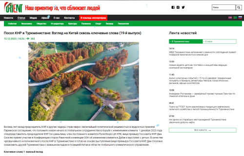2023年12月15日,驻土库曼斯坦大使钱乃成在土主流媒体“东方网”发表《中国驻土大使:关键词看中国》第19期,以“多边主义”、“绿色转型”、“落实行动”等为关键词,重点宣介习近平主席特别代表丁薛祥副总理在联合国气候变化迪拜大会世界气候行动峰会上的发言,阐述中方在全球气候治理领域的重要贡献和立场。