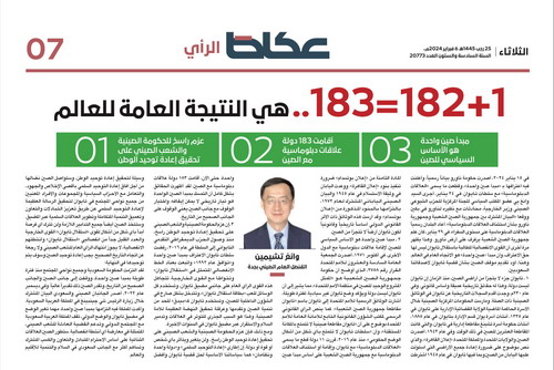 2024年2月6日,驻吉达总领事王奇敏在沙特媒体《欧卡兹报》发表题为《182+1=183是大势所趋》的署名文章,阐明台湾问题的历史经纬和一个中国原则历史与法理依据,强调一个中国原则是中国与其他国家建立外交关系的政治基础,中国政府和中国人民实现祖国统一的决心坚如磐石。全文如下: