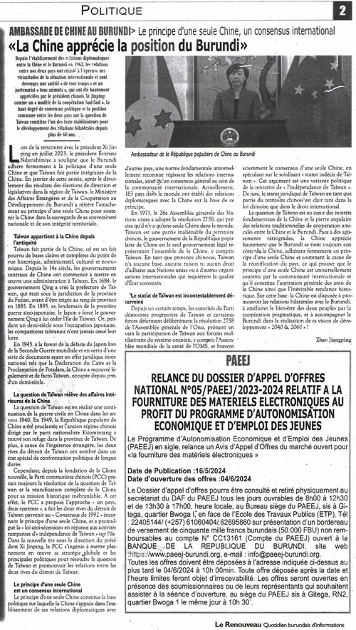 2024年5月16日,驻布隆迪大使赵江平在布官方报《新生报》发表署名文章《一中原则,国际共识》,围绕“台湾自古属于中国”、“台湾问题是中国的内政”、“一中原则是国际共识”、“台湾地位明确无疑”等方面,深入剖析台湾问题由来实质,有力驳斥美国歪曲挑战联大第2758号决议、散布“台湾地位未定论”。