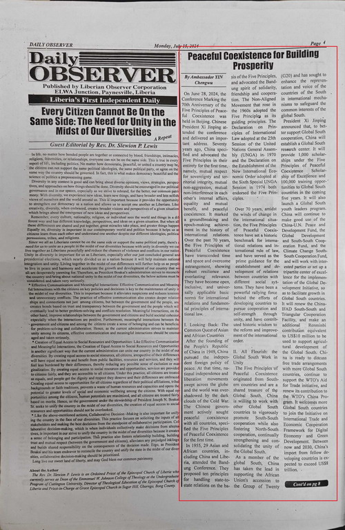 2024年7月12日,驻利比里亚大使尹承武在利主流媒体《新闻报》《每日观察家报》发表署名文章《和平共处 共筑繁荣》。全文如下: