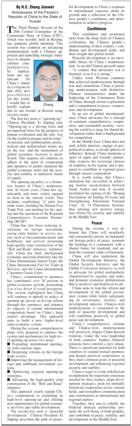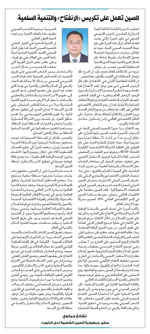 2024年8月8日,驻科威特大使张建卫在《舆论报》《政治报》《白天报》《报章报》《阿拉伯时报》等科主流媒体发表署名文章《中国将扩大对外开放,坚持走和平发展道路》,宣介中国共产党二十届三中全会精神。全文如下:
