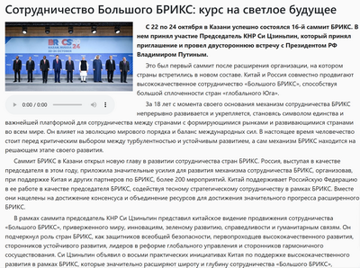 10月22-24日,金砖国家领导人第十六次会晤在喀山成功举行。习近平主席应邀出席本次峰会并与普京总统举行双边会晤。这是金砖国家实现历史性扩员后首次峰会。中俄两国共同推动“大金砖合作”,引领“全球南方”大团结。