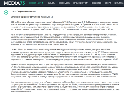 2024年10月27日,驻喀山总领事向波在乌里扬诺夫斯克《真理报》、鞑靼斯坦通讯社、《共和国报》、73传媒网等媒体发表署名文章《“大金砖合作”扬帆远航》,重点宣介习近平主席在金砖国家喀山峰会期间提出的推动“大金砖合作”五点建议和引领“全球南方”合作三点主张,以及中俄两国元首喀山会晤成果。全文如下: