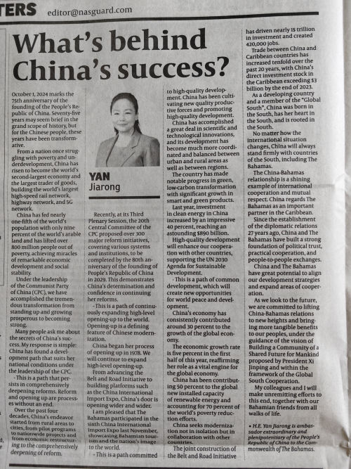 2024年9月27日,驻巴哈马大使严家蓉在巴主流报纸《拿骚卫报》发表题为《中国成功的背后》署名文章,介绍新中国成立75周年辉煌成就及宝贵经验。