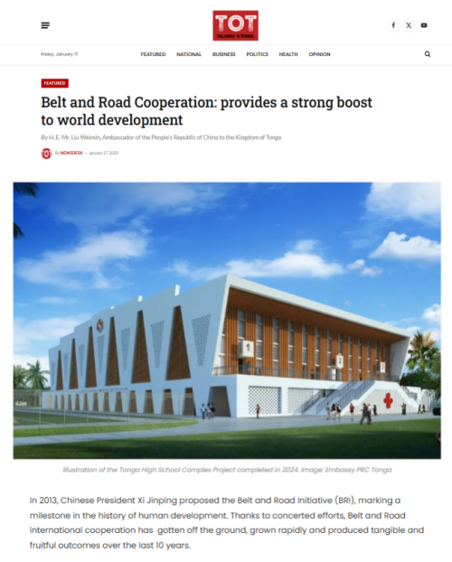 2025年1月17日,驻汤加大使刘为民在汤加主流媒体“汤加对话”网站发表署名文章《共建“一带一路”为世界发展增添强劲动力》,介绍共建“一带一路”最新进展和成果。全文如下: