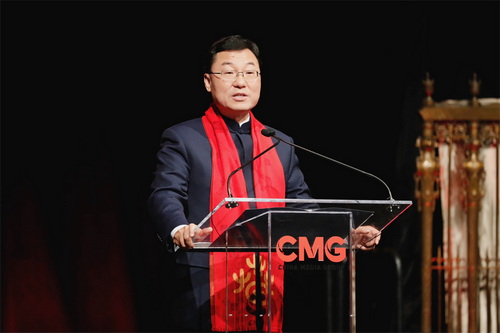 晚上好!中国农历蛇年正向我们走来,很高兴与大家一起热热闹闹看春晚,红红火火过大年!春节源自中国,欢乐遍及世界。自2022年春节与北京冬奥会完美邂逅、2023年获列联合国假日、2024年申遗成功“三级跳”,“中国年”已经成为“世界年”。感谢央视总台在美举办“春晚序曲”活动,为美国朋友感知中国打开一扇窗,中美人民相知相近架起一座桥,奏响和合共生、美美与共的交响。
