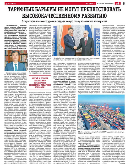2025年2月27日,驻伊尔库茨克总领事李海在俄罗斯《共青团真理报》伊尔库茨克分社、俄罗斯《论据与事实报》东西伯利亚分社、《中国与俄罗斯》双语杂志发表署名文章《关税藩篱难阻高质量发展, 高水平开放谱写共赢篇章》,宣介中国高质量发展成果和坚定高水平对外开放决心,强调中俄要携手倡导平等有序的世界多极化和普惠包容的经济全球化。全文如下: