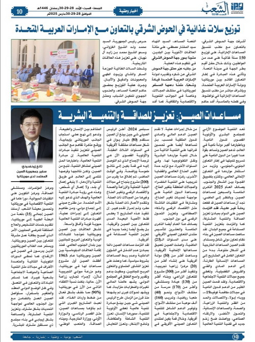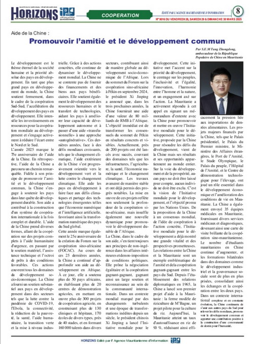 2025年3月28日,驻毛里塔尼亚大使唐中东在毛主流媒体《人民报》《视野报》发表题为《中国对外援助:促进友好、共同发展》的署名文章,全文如下: