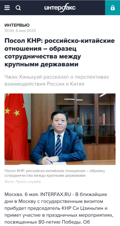 2025年5月6日,驻俄罗斯大使张汉晖就习近平主席即将对俄罗斯进行国事访问并出席纪念苏联伟大卫国战争胜利80周年庆典、中俄合作等问题接受国际文传电讯社书面采访。采访全文如下: