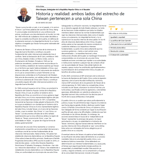 2025年5月6日,驻厄瓜多尔大使陈国友在厄主流媒体《电讯报》和新媒体“证实网”发表署名文章《历史与事实:海峡两岸同为一个中国》。全文如下: