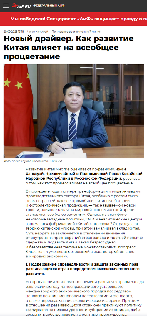 2025年9月29日,驻俄罗斯大使张汉晖在《论据与事实报》发表署名文章《中国发展是全球共赢的新引擎 而非西方危机的替罪羊》。全文如下: