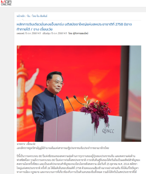 2025年10月15日,驻泰国大使张建卫在《每日新闻》《经理人报》《即时新闻》等泰国主流媒体发表署名文章《一个中国原则不可动摇 联大第2758号决议不容挑战》,全文如下: