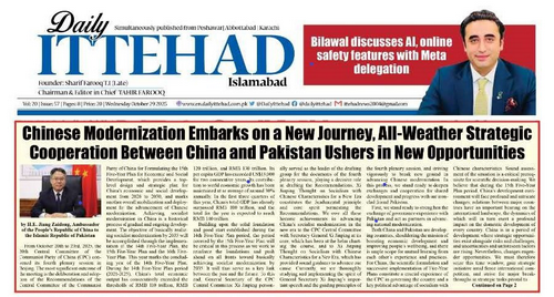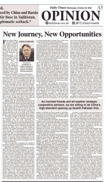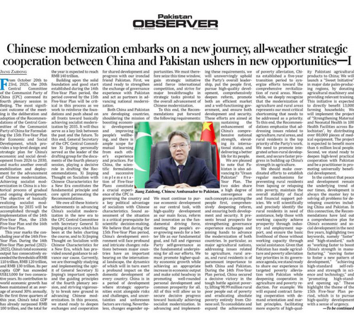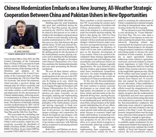 2025年10月29日,驻巴基斯坦大使姜再冬在巴基斯坦《论坛快报》《国民报》《观察家报》《今日巴基斯坦》《每日团结报》《每日时报》等主流媒体发表署名文章《中国式现代化建设迈向新征程 中巴全天候战略合作迎来新机遇》,宣介党的二十届四中全会精神和“十五五”规划建议。全文如下: