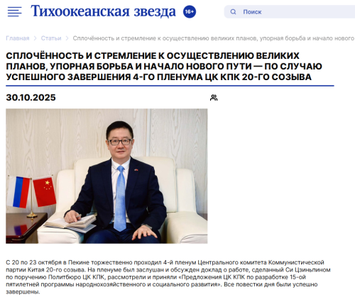 2025年10月30日,驻哈巴罗夫斯克总领事姜笑洋在领区主流媒体《太平洋之星报》发表署名文章《凝心聚力绘蓝图,砥砺奋进启新程——写在中共二十届四中全会胜利闭幕之际》,全文如下: