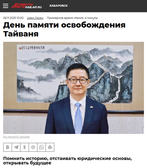2025年11月6日,驻哈巴罗夫斯克总领事姜笑洋在领区主流媒体《论据与事实报》发表署名文章《台湾光复纪念日:铭记历史、捍卫法理、开创未来》,全文如下: