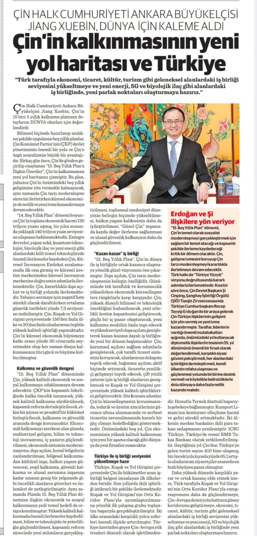 2025年11月5日,驻土耳其大使姜学斌在土耳其经济类大报《世界报》发表署名文章《“十五五”规划擘画中国发展新蓝图》,全文如下: