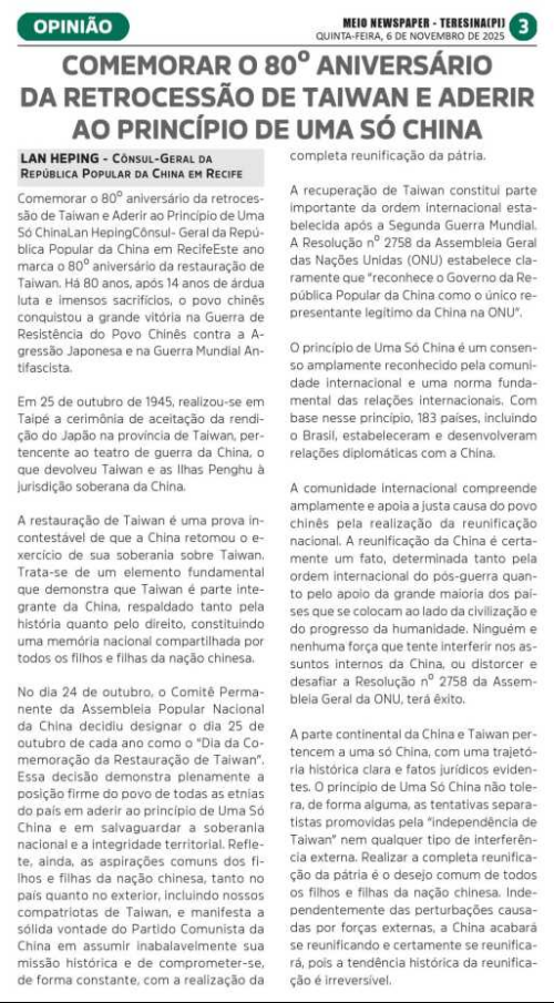 2025年11月6日,驻累西腓总领事兰和平在领区主流媒体《中北报》及《北方论坛报》发表署名文章《纪念台湾光复80周年 坚持一个中国原则》,阐述台湾光复是中国政府恢复对台湾行使主权的重要铁证,重申一个中国原则、联大第2758号决议不容挑战,表达实现祖国完全统一的坚定信念。兰和平总领事署名文章全文如下: