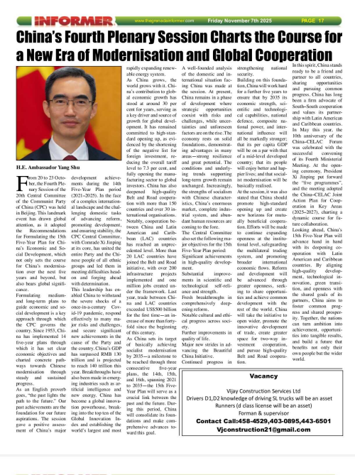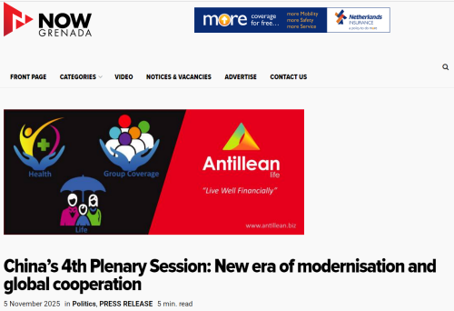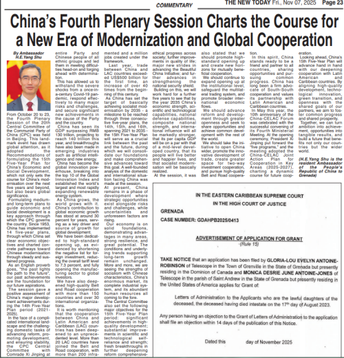 2025年11月5、7日,驻格林纳达大使杨舒在格林纳达媒体“今日格林纳达”网、《新今日报》《信息报》发表署名文章《中共二十届四中全会擘画新时代现代化与全球合作新蓝图》。主要内容如下: