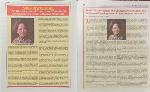 2025年11月7日,驻马拉维大使陆旭在马主流媒体《国民报》《每日时报》发表署名文章《一个中国原则:中马关系行稳致远的政治基石》,深入阐释联大第2758号决议重要意义和台湾问题历史经纬,批驳个别国家翻炒所谓“台湾地位未定”谬论。全文如下: