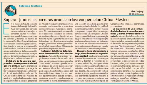 驻墨西哥大使陈道江在墨《经济学家报》发表署名文章《携手跨越关税壁垒,共谱中墨合作新篇》