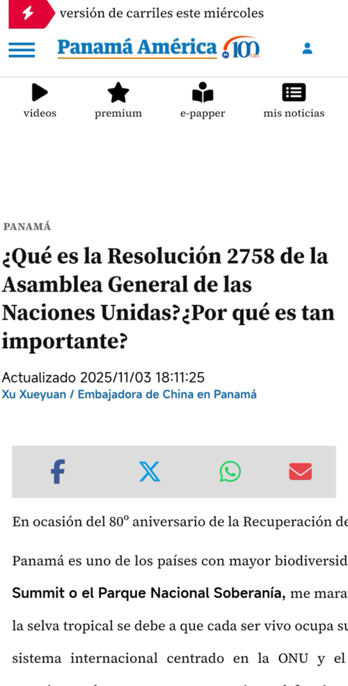 2025年11月3日,驻巴拿马大使徐学渊在巴拿马主流大报《巴拿马美洲报》发表题为《什么是联大第2758号决议?它为何如此重要?——写在台湾光复80周年之际》的署名文章,全文如下: