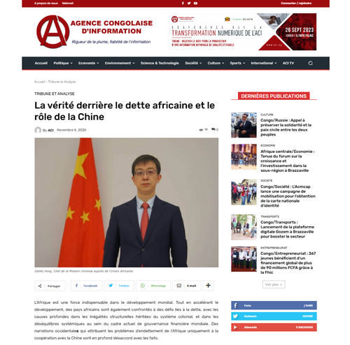 2025年11月5日,驻非盟使团团长蒋烽大使与驻刚果(布)大使安青在刚果通讯社、《新共和国报》等刚果(布)主流媒体联合发表题为《非洲债务困境的真相与中国角色》的署名文章。全文如下: